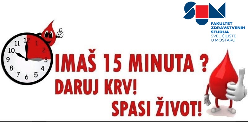 U utorak, 10.11.2020. godine, u vremenu od 10:00 do 12.00 sati u prostorijama Fakulteta zdravstvenih studija Sveučilišta u Mostaru održati će se akcija dobrovoljnog darivanja krvi.
